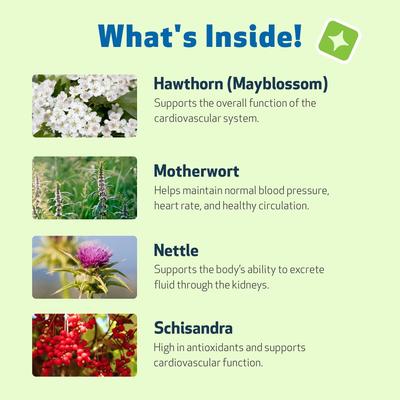 Active Ingredients: Mayblossom Berry, Buds And Leaf (Crataegus spp.), Motherwort Herb (Leonurus cardiaca), Nettle Herb (Urtica dioica), Fo-Ti Root (Polygonum multiflorum), Schisandra Fruit (Schisandra chinensis), Gotu Kola Herb (Centella asiatica), Ginger Rhizome (Zingiber officinalis).