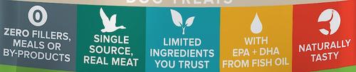 - Chewy treat made with limited ingredients—real duck is the first ingredient.
