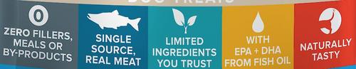 - Chewy treat made with limited ingredients—real salmon is the first ingredient.