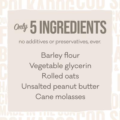 Rolled Oats, Vegetable Glycerin, Barley Flour, Unsalted Peanut Butter (Dry Roasted Peanuts), Cane Molasses