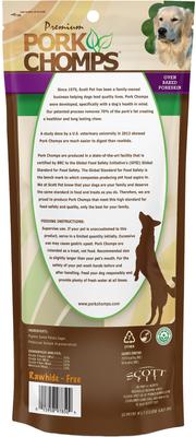 Rawhide-Free, great-tasting and naturally delicious, it's no wonder Pork Chomps have earned the loyalty of so many dogs! Pork Chomps are made of oven-baked pork skin, which is easily digested. When dogs switch from ordinary rawhide to Pork Chomps, the risk of developing an intestinal blockage is greatly reduced. And pet parents love the fact that dogs don't just chew them - they eat them - leaving behind no slimy messes to clean up. Pork Chomps not only satisfy the instinctive need to chew, they also clean dog's teeth. With a wide selection of shapes, flavors, and sizes to choose from, the world of Premium Pork Chomps offers the perfect chew for every dog!