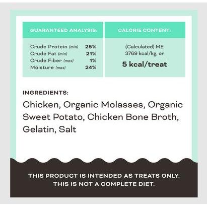 Pollo, melaza orgánica, boniato orgánico, caldo de hueso de pollo, gelatina, sal