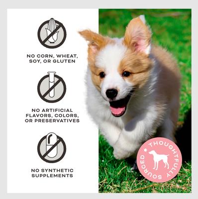 - Made without grain, corn, wheat, soy, artificial colors, flavors, and preservatives.