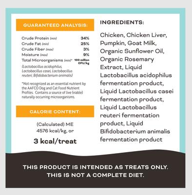 Chicken, Chicken Liver, Pumpkin, Goat Milk, Organic Sunflower Oil, Organic Rosemary Extract, Liquid Lactobacillus acidophilus fermentation product, Liquid Lactobacillus casei fermentation product, Liquid Lactobacillus reuteri fermentation product, Liquid Bifidobacterium animalis fermentation product