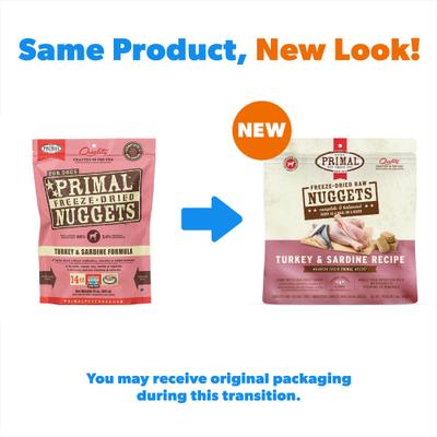 Primal Turkey & Sardine Formula Nuggets Grain-Free Raw Freeze-Dried Dog Food offers your hungry pooch all the benefits of a safe and wholesome raw-food diet—without you having to grind, chop, measure or mix the ingredients yourself! Taking great pride to source only the best ingredients, this tasty and nutritious diet is packed with naturally derived vitamins and minerals. The high-protein ratio appeals to your canine companion’s primal diet, and it’s an excellent way to maintain a proper weight and boost overall health. And best of all, it’s a breeze to serve, thanks to the naturally preserved nuggets—just add water! The proof comes in watching her lick the bowl clean while thriving happily and healthfully.