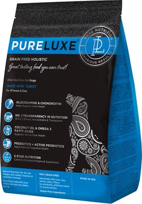 Treat your loyal companion to Pureluxe Elite Nutrition Grain-Free Turkey Dry Dog Food. This formula is perfect for dogs who strive to be in top condition while lounging on the couch or going for a run. With real turkey as the first ingredient, this high-protein and low-glycemic food is packed with essential nutrients like omega-3 fatty acids, pre and probiotics, and coconut oil to keep your dog looking and feeling their best. You can rotate this formula with Elite Nutrition Lamb and Salmon options (sold separately) for added variety. And with Pureluxe’s Nutritional Transparency, you can enter the code on the back of any bag into their website and see exactly what goes into their kibble. From cook percentage to heavy metal content, you’ll get everything you need to make a smart dietary decision for your pup.
