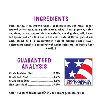 - La carne real es el primer ingrediente de estas deliciosas golosinas, y hay tocino real en cada bocado carnoso para volver loco a tu amigo de cuatro patas.