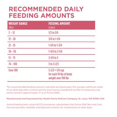INSTRUCCIONES DE ALIMENTACIÓN PARA PERROS ADULTOS: Las cantidades recomendadas se basan en las necesidades nutricionales promedio de un perro adulto con un nivel de actividad normal (utilizando una taza medidora estándar de 250 ml/8 oz, que contiene aproximadamente 117 g de Purina ONE). Factores como el metabolismo, el tamaño de la raza, el nivel de actividad, la edad y si la perra está esterilizada o castrada afectarán la cantidad de Purina ONE necesaria para mantener una condición corporal ideal. Los expertos en mascotas de Purina han proporcionado las cantidades indicadas como punto de partida. Si nota que su perro está perdiendo peso o tiene sobrepeso cuando se alimenta con estas cantidades, ajústelas según corresponda. Para ayudar a su perro a mantener una condición corporal ideal, controle su peso regularmente, asegurándose de que sus costillas se sientan fácilmente y su cintura sea visible cuando se mira desde arriba. Mantener una condición corporal ideal puede afectar la salud de su perro durante toda su vida. NO ES PARA TODOS LOS PERROS Purina ONE Skin and Coat Formula está específicamente formulada para perros adultos. Si tiene un cachorro, una perra embarazada o lactante, aliméntelo con Purina ONE Healthy Puppy Formula. SE PUEDE SERVIR SECO O HUMEDECIDO Purina ONE se puede administrar seco o mezclado con agua. Si se mezcla, sugerimos una parte de líquido por cuatro partes de Purina ONE. ALIMENTE SOLO UNO El sistema digestivo de un perro funciona mejor cuando recibe el mismo alimento todos los días. Aunque los humanos anhelan variedad en sus dietas, los perros no. Alimentar a tu perro con diferentes alimentos puede convertirlo en un comensal quisquilloso. Evita darle restos de comida, ya que pueden alterar el equilibrio nutricional de su alimento habitual y provocar obesidad. La mejor manera de alimentar a tu perro es darle solo un alimento al día.