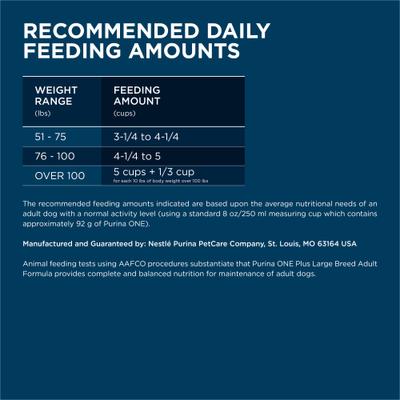 The recommended feeding amounts indicated are based upon the average nutritional needs of an adult dog with a normal activity level (using a standard 8 oz/250 ml measuring cup which contains approximately 92 g of Purina ONE). Factors, such as a dog’s metabolism, breed size, activity level, age and whether the dog is spayed or neutered, will affect the amount of Purina ONE needed to maintain an ideal body condition. The pet experts at Purina have provided the feeding amounts indicated as a starting point. If you find that your dog is losing weight or becomes overweight when fed these amounts, please adjust accordingly. To help your dog maintain an ideal body condition, monitor your dog’s weight on a regular basis, making sure that his ribs are easily felt and his waist is visible when viewed from above. Maintaining an ideal body condition can impact your dog's lifelong health.