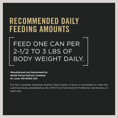 Give your kitty a sensory experience full of seafood yum with Purina Pro Plan Complete Essentials Seafood Stew Entree in Sauce Adult Wet Cat Food. Real seafood is blended with other high-quality ingredients to create a meal loaded with flavor, and a delicate sauce adds a finishing touch cats adore. The combo of delicious taste and tender texture brings on a mealtime adventure for kitties. Plus, each serving is loaded with the good stuff your feline friend needs, like vitamin A and taurine to support her vision. Linoleic acid and vitamin A nourish her skin and super-soft coat. Antioxidants promote her immune system health, and optimal protein levels help maintain an ideal body condition. Best of all, you can feel good knowing each high-quality ingredient is chosen for a specific purpose to support your pal’s happy, playful life.