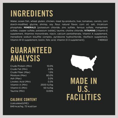 Water, Ocean Fish, Wheat Gluten, Chicken, Meat By-Products, Liver, Tomatoes, Carrots, Corn Starch-Modified, Glycine, Shrimp, Soy Flour, Natural Flavor, Corn Oil, Salt, Tricalcium Phosphate, MINERALS [Potassium Chloride, Zinc Sulfate, Ferrous Sulfate, Manganese Sulfate, Copper Sulfate, Potassium Iodide], Taurine, Choline Chloride, VITAMINS [Vitamin E Supplement, Thiamine Mononitrate, Niacin, Calcium Pantothenate, Vitamin A Supplement, Menadione Sodium Bisulfite Complex, Pyridoxine Hydrochloride, Riboflavin Supplement, Vitamin B-12 Supplement, Biotin, Folic Acid, Vitamin D-3 Supplement]. F469022.