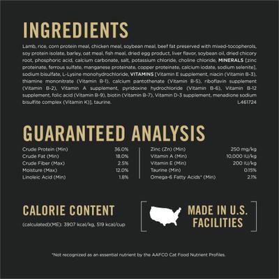 Lamb, Rice, Corn Gluten Meal, Chicken Meal, Soybean Meal, Soy Protein Isolate, Fish Meal, Beef Fat Preserved With Mixed-tocopherols, Dried Egg Product, Natural Flavor, Oat Meal, Soybean Oil, Wheat Flour, Chicory Root Inulin, Gelatin, Potassium Chloride, Phosphoric Acid, Salt, Minerals [Zinc Proteinate, Manganese Proteinate, Ferrous Sulfate, Copper Proteinate, Calcium Iodate, Sodium Selenite], Choline Chloride, L-lysine Monohydrochloride, Vitamins [Vitamin E Supplement, Niacin (Vitamin B-3), Vitamin A Supplement, Calcium Pantothenate (Vitamin B-5), Thiamine Mononitrate (Vitamin B-1), Riboflavin Supplement (Vitamin B-2), Vitamin B-12 Supplement, Pyridoxine Hydrochloride (Vitamin B-6), Folic Acid (Vitamin B-9), Vitamin D-3 Supplement, Biotin (Vitamin B-7), Menadione Sodium Bisulfite Complex (Vitamin K)], Taurine, Dried Bacillus Coagulans Fermentation Product, Calcium Carbonate. K461719.