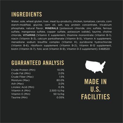 Water, Sole, Wheat Gluten, Liver, Meat By-Products, Chicken, Tomatoes, Carrots, Corn Starch-Modified, Glycine, Corn Oil, Salt, Soy Protein Concentrate, Tricalcium Phosphate, Natural Flavor, Minerals [Potassium Chloride, Zinc Sulfate, Ferrous Sulfate, Manganese Sulfate, Copper Sulfate, Potassium Iodide], Taurine, Choline Chloride, Vitamins [Vitamin E Supplement, Thiamine Mononitrate (Vitamin B-1), Niacin (Vitamin B-3), Calcium Pantothenate (Vitamin B-5), Vitamin A Supplement, Menadione Sodium Bisulfite Complex (Vitamin K), Pyridoxine Hydrochloride (Vitamin B-6), Riboflavin Supplement (Vitamin B-2), Vitamin B-12 Supplement, Biotin (Vitamin B-7), Folic Acid (Vitamin B-9), Vitamin D-3 Supplement]. E468520.