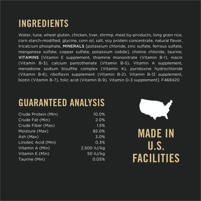 Water, Tuna, Wheat Gluten, Chicken, Liver, Shrimp, Meat By-Products, Long Grain Rice, Corn Starch-Modified, Glycine, Corn Oil, Salt, Soy Protein Concentrate, Natural Flavor, Tricalcium Phosphate, MINERALS [Potassium Chloride, Zinc Sulfate, Ferrous Sulfate, Manganese Sulfate, Copper Sulfate, Potassium Iodide], Choline Chloride, Taurine, VITAMINS [Vitamin E Supplement, Thiamine Mononitrate (Vitamin B-1), Niacin (Vitamin B-3), Calcium Pantothenate (Vitamin B-5), Vitamin A Supplement, Menadione Sodium Bisulfite Complex (Vitamin K), Pyridoxine Hydrochloride (Vitamin B-6), Riboflavin Supplement (Vitamin B-2), Vitamin B-12 Supplement, Biotin (Vitamin B-7), Folic Acid (Vitamin B-9), Vitamin D-3 Supplement]. F468420