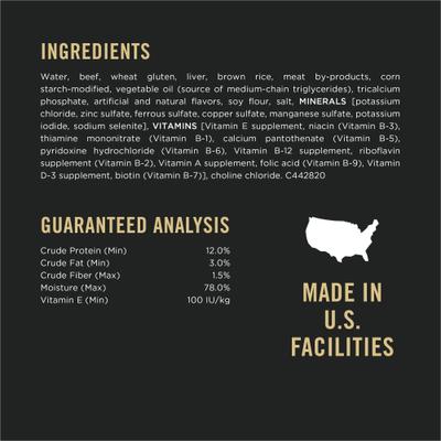 Water, Beef, Wheat Gluten, Liver, Brown Rice, Meat By-Products, Corn Starch-Modified, Vegetable Oil (Source Of Medium-Chain Triglycerides), Tricalcium Phosphate, Artificial And Natural Flavors, Soy Flour, Salt, MINERALS [Potassium Chloride, Zinc Sulfate, Ferrous Sulfate, Copper Sulfate, Manganese Sulfate, Potassium Iodide, Sodium Selenite], VITAMINS [Vitamin E Supplement, Niacin (Vitamin B-3), Thiamine Mononitrate (Vitamin B-1), Calcium Pantothenate (Vitamin B-5), Pyridoxine Hydrochloride (Vitamin B-6), Vitamin B-12 Supplement, Riboflavin Supplement (Vitamin B-2), Vitamin A Supplement, Folic Acid (Vitamin B-9), Vitamin D-3 Supplement, Biotin (Vitamin B-7)], Choline Chloride. C442820.