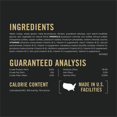 Water, Turkey, Wheat Gluten, Meat By-Products, Chicken, Powdered Cellulose, Corn Starch-Modified, Glycine, Salt, Vegetable Oil, Natural Flavor, MINERALS [Potassium Chloride, Zinc Sulfate, Ferrous Sulfate, Manganese Sulfate, Copper Sulfate, Potassium Iodide], Tricalcium Phosphate, Choline Chloride, Taurine, VITAMINS [Thiamine Mononitrate (Vitamin B-1), Vitamin E Supplement, Niacin (Vitamin B-3), Calcium Pantothenate (Vitamin B-5), Vitamin A Supplement, Menadione Sodium Bisulfite Complex (Vitamin K), Pyridoxine Hydrochloride (Vitamin B-6), Riboflavin Supplement (Vitamin B-2), Vitamin B-12 Supplement, Biotin (Vitamin B-7), Folic Acid (Vitamin B-9), Vitamin D-3 Supplement], Vitamin E Supplement. B475823