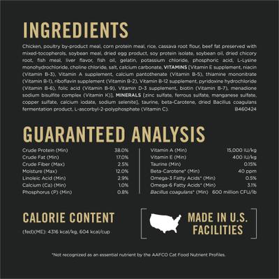 Chicken, Poultry By-Product Meal, Corn Protein Meal, Rice, Cassava Root Flour, Beef Fat Preserved With Mixed-Tocopherols, Soybean Meal, Dried Egg Product, Soy Protein Isolate, Soybean Oil, Dried Chicory Root, Fish Meal, Liver Flavor, Fish Oil, Gelatin, Potassium Chloride, Phosphoric Acid, L-Lysine Monohydrochloride, Choline Chloride, Salt, Calcium Carbonate, VITAMINS [Vitamin E Supplement, Niacin (Vitamin B-3), Vitamin A Supplement, Calcium Pantothenate (Vitamin B-5), Thiamine Mononitrate (Vitamin B-1), Riboflavin Supplement (Vitamin B-2), Vitamin B-12 Supplement, Pyridoxine Hydrochloride (Vitamin B-6), Folic Acid (Vitamin B-9), Vitamin D-3 Supplement, Biotin (Vitamin B-7), Menadione Sodium Bisulfite Complex (Vitamin K)], MINERALS [Zinc Sulfate, Ferrous Sulfate, Manganese Sulfate, Copper Sulfate, Calcium Iodate, Sodium Selenite], Taurine, Beta-Carotene, Dried Bacillus Coagulans Fermentation Product, L-Ascorbyl-2-Polyphosphate (Vitamin C). B460424