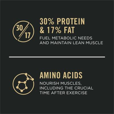 - Active dog food for senior dogs with 30 percent protein and 17 percent fat to help fuel metabolic needs and maintain lean muscle.