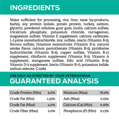 Agua, subproductos cárnicos, arroz, cebada, aislado de proteína de soya, proteína de papa, salmón, glicerina, celulosa en polvo, goma guar, inulina, sulfato de calcio, fosfato tricálcico, cloruro de potasio, carragenina, sulfato de magnesio, suplemento de vitamina E, monoclorhidrato de L-lisina, sulfato de zinc, niacina (vitamina B-3), sulfato ferroso, mononitrato de tiamina (vitamina B-1), pantotenato de calcio (vitamina B-5), sabor ahumado natural, clorhidrato de piridoxina (vitamina B-6), sulfato de cobre, vitamina Suplemento de B-12, suplemento de riboflavina (vitamina B-2), suplemento de vitamina A, sulfato de manganeso, ácido fólico (vitamina B-9), suplemento de vitamina D-3, biotina (vitamina B-7), yoduro de potasio, selenito de sodio. D258920