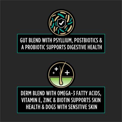 - The Derm base blend gives your dog omega-3 fatty acids, vitamin E, zinc, and biotin to nourish sensitive skin.