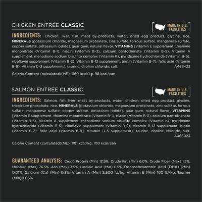 Chicken Entrée: Chicken, Liver, Fish, Meat By-Products, Water, Dried Egg Product, Glycine, Rice, MINERALS [Potassium Chloride, Magnesium Proteinate, Zinc Sulfate, Ferrous Sulfate, Manganese Sulfate, Copper Sulfate, Potassium Iodide], Guar Gum, Natural Flavor, VITAMINS [Vitamin E Supplement, Thiamine Mononitrate, Niacin, Calcium Pantothenate, Vitamin A Supplement, Menadione Sodium Bisulfite Complex, Pyridoxine Hydrochloride, Riboflavin Supplement, Vitamin B-12 Supplement, Biotin, Folic Acid, Vitamin D-3 Supplement], Taurine, Choline Chloride, Salt. A465423; Salmon Entrée: Salmon, Meat By-Products, Water, Fish, Chicken, Brown Rice, Dried Chicory Root, Fish Oil, Glycine, MINERALS [Potassium Chloride, Magnesium Proteinate, Zinc Sulfate, Ferrous Sulfate, Manganese Sulfate, Copper Sulfate, Potassium Iodide], Guar Gum, Natural Flavor, Sodium Bisulfate, Taurine, Choline Chloride, VITAMINS [Vitamin E Supplement, Thiamine Mononitrate, Niacin, Calcium Pantothenate, Vitamin A Supplement, Menadione Sodium Bisulfite Complex, Pyridoxine Hydrochloride, Riboflavin Supplement, Vitamin B-12 Supplement, Biotin, Folic Acid, Vitamin D-3 Supplement], Salt. A472621.