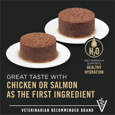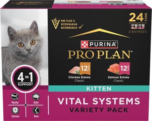 Delight your kitten with Purina Pro Plan Vital Systems Chicken & Salmon Entrée Variety Pack 4-in-1 Muscles, Brain, Immune & Bone Wet Kitten Food. This variety pack features two drool-worthy kitten food entrees that support muscles, brain, immune, and bone health. Designed for your new furbaby, these formulas feature real chicken or real salmon as the number one ingredient, paired with other targeted ingredients to support your kitty’s vital systems. Loaded with protein for lean muscle and heart support, DHA to support brain development, antioxidants to support immune health, and calcium for strong bones. It’s a great-tasting meal that fuels your furbaby as she grows and develops.