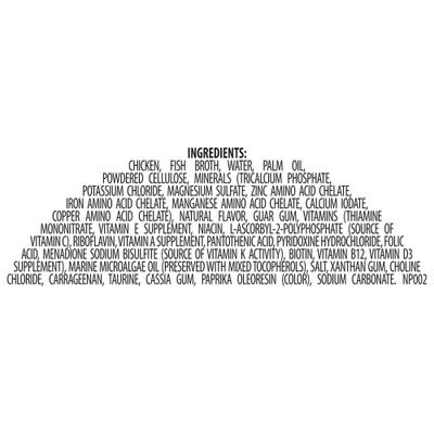 Chicken, Water, Vegetable Oil, Powdered Cellulose, Tricalcium Phosphate, Salt, Potassium Chloride, Guar Gum, Xanthan Gum, Choline Chloride, Magnesium Sulfate, Calcium Carbonate, Carrageenan, Cassia Gum, Fructooligosaccharide, Taurine, Paprika Powder, Zinc Proteinate, Iron Proteinate, L-Ascorbyl-2-Polyphosphate (Source of Vitamin C), Vitamin E Supplement, Thiamine Mononitrate, Niacin, Manganese Proteinate, Vitamin A Supplement, Copper Proteinate, Calcium Iodate, Pantothenic Acid, Sodium Selenite, Riboflavin, Vitamin B12 Supplement, Pyridoxine Hydrochloride, Folic Acid, Vitamin D3 Supplement, Biotin, Menadione Sodium Bisulfite Complex (Source of Vitamin K Activity).