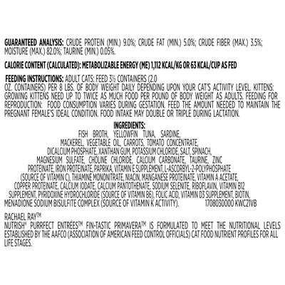 Fuel your kitty’s adventures with the whisker-licking nutrition of the Rachael Ray Nutrish Purrfect Entrees Grain-Free Fin-Tastic Primavera with Yellowfin Tuna & Veggies in Savory Sauce Wet Cat Food. Formulated with real yellowfin tuna, slowly simmered in a savory sauce—just like Rachael would cook in her own kitchen—it provides plenty of easily-digestible protein to support healthy muscles, and the flavor and texture cats find irresistible. Every bite is packed with everything your pal needs to look and feel his best, including vitamins, minerals, omegas, taurine and antioxidants. So fill up his bowl and satisfy your pal’s instinctive cravings for real meat, while you can feel good about keeping him satisfied and nourished from nose to tail!