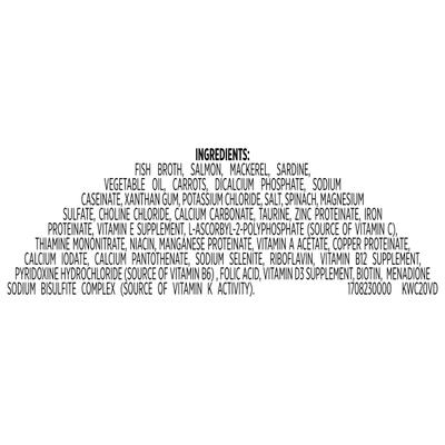 Fish Broth, Salmon, Mackerel, Sardine, Vegetable Oil, Carrots, Dicalcium Phosphate, Sodium Caseinate, Xathan Gum, Potassium Chloride, Salt, Spinach, Magnesium Sulfate, Choline Chloride, Calcium Carbonate, Taurine, Zinc Proteinate, Iron Proteinate, Vitamin E Supplement, L-Ascorbyl-2-Polyphosphate (source of Vitamin C), Thiamine Mononitrate, Niacin, Manganese Proteinate, Vitamin A Acetate, Copper Proteinate, Calcium Iodate, Calcium Pantothenate, Sodium Selenite, Riboflavin, Vitamin B12 Supplement, Pyridoxine Hydrocholoride (Souce of Vitamin B6), Folic Acid, Vitamin D3 Supplement, Biotin, Menadione Sodium Bisulfite Complex (Source of Vitamin K Activity).