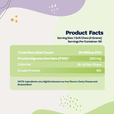 - Chews contain a soothing blend of probiotics, prebiotics, and pumpkin seed powder.