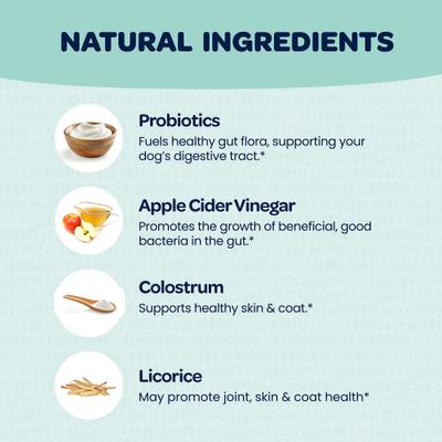 - Soft chews contain a soothing blend of colostrum, apple cider vinegar, licorice, omega-3 fatty acids, probiotics, and salmon oil.
