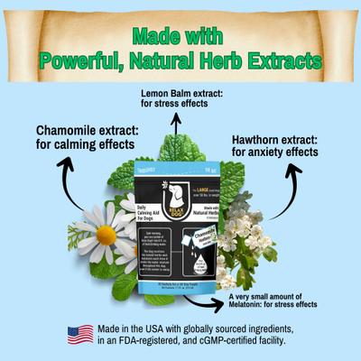 - Featuring natural herbs and a small amount of melatonin to temporarily reduce hyperactivity, separation anxiety, and stress.