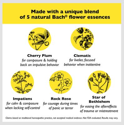 - Made from a combination of five flower remedies, including Star of Bethlehem, Rock Rose, Cherry Plum, Impatiens and Clematis