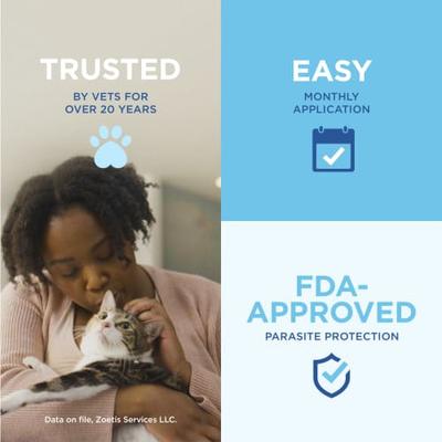 El más común es la pérdida de pelo en el lugar de aplicación, con o sin inflamación (enrojecimiento, descamación) en gatos. Otros efectos secundarios reportados en gatos y perros incluyen vómitos, diarrea con o sin sangre, anorexia (disminución del apetito), letargo (lentitud), salivación, respiración rápida, prurito (picazón), urticaria (ronchas, ronchas), eritema (enrojecimiento de la piel), ataxia (falta de coordinación), fiebre y, en raras ocasiones, muerte. También se han reportado convulsiones en perros en raras ocasiones. Si tiene preguntas adicionales sobre posibles efectos secundarios, consulte a su veterinario.