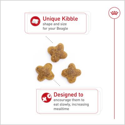 - Specialized kibble designed specifically to help Beagles chew and eat food slowly.