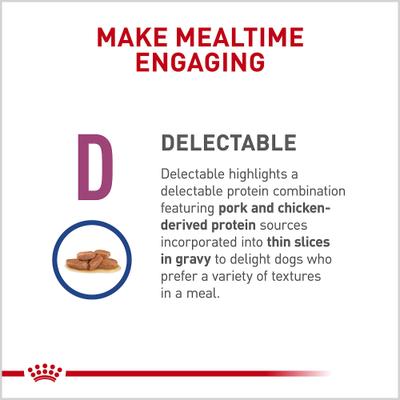- D = Delicioso, ayuda a estimular el apetito en los perros y anima a comer con bocaditos con textura de salsa.