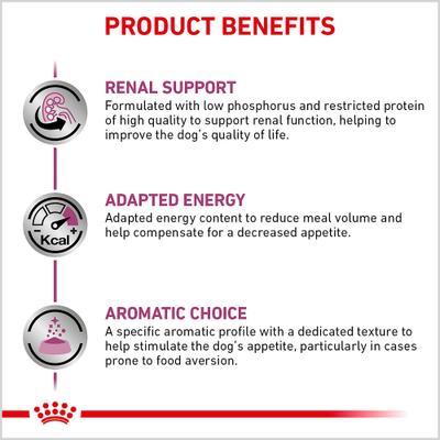 - Funciona en conjunto con una variedad de alimentos húmedos y secos para perros Royal Canin Renal Support que estimulan el apetito. Variedades.