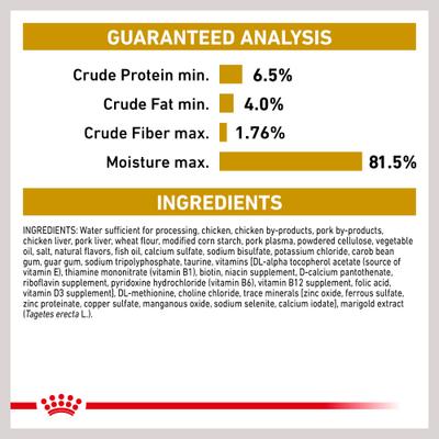 Water Sufficient For Processing, Chicken, Chicken By-Products, Pork By-Products, Chicken Liver, Pork Liver, Wheat Flour, Modified Corn Starch, Pork Plasma, Powdered Cellulose, Vegetable Oil, Salt, Natural Flavors, Fish Oil, Calcium Sulfate, Sodium Bisulfate, Potassium Chloride, Carob Bean Gum, Guar Gum, Sodium Tripolyphosphate, Taurine, Vitamins [Dl-Alpha Tocopherol Acetate (Source Of Vitamin E), Thiamine Mononitrate (Vitamin B1), Biotin, Niacin Supplement, D-Calcium Pantothenate, Riboflavin Supplement, Pyridoxine Hydrochloride (Vitamin B6), Vitamin B12 Supplement, Folic Acid, Vitamin D3 Supplement], Dl-Methionine, Choline Chloride, Trace Minerals [Zinc Oxide, Ferrous Sulfate, Zinc Proteinate, Copper Sulfate, Manganous Oxide, Sodium Selenite, Calcium Iodate], Marigold Extract (Tagetes Erecta L.).