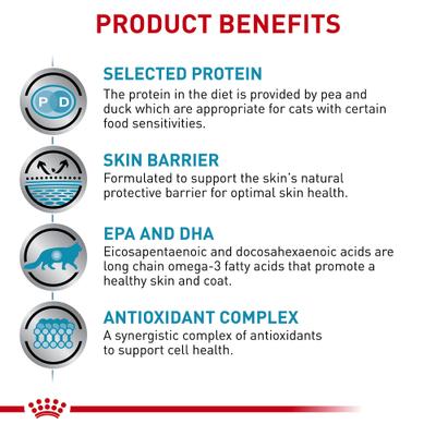 - A veterinary-exclusive diet made with peas and duck for adult cats and kittens with food sensitivities.