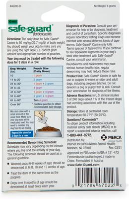 If your dog tests positive for internal parasites, your vet may prescribe Safe-Guard (fenbendazole) Canine 2 gm to treat and control those parasites. This product is effective against the four major types of parasites in dogs, including roundworms, hookworms, whipworms and taenia tapeworms. It’s easy to feed—just mix the powder into your dog’s food and make sure that your pup eats the full dose. You’ll need to repeat the dose for three days in a row. This deworming medication is considered safe for use in all dogs ages six weeks and older, including pregnant dogs.
