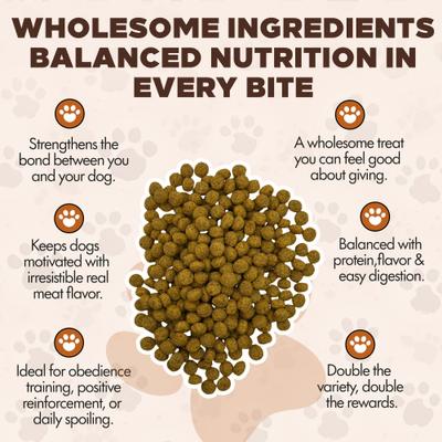 Give your furbaby a tasty reward during every training session with Scoochie Pet Chewka Real Meat Mixed Variety Pack Bacon & Peanut Butter Flavor Training Bites Dog Treats. These bite-sized soft treats are crafted with real meat and packed with mouth-watering peanut butter flavor to keep your furry friend eager to learn and please. The perfect size for frequent rewarding, these treats are ideal for obedience training, positive reinforcement, or simply spoiling your pup. Their soft and chewy texture makes them easy to break apart for smaller dogs or extended training sessions. Plus, they’re made without any artificial flavors or fillers, making them a nutritious and protein-packed reward that you can feel good about giving to your best friend.