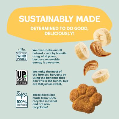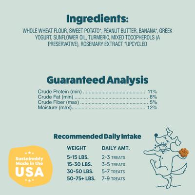 Whole Wheat Flour, Sweet Potato (Upcycled), Peanut Butter, Banana Upcycled), Greek Yogurt, Sunflower Oil, Turmeric, Mixed Tocopherols (Preservative), Rosemary Extract.