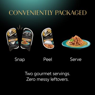 - Sheba Gravy Indulgence ofrece un 70 % de salsa por 30 % de trozos, lo que proporciona más salsa que los cortes Sheba Perfect Portions en salsa (se venden por separado) para ayudar a mantener a tu gato hidratado.