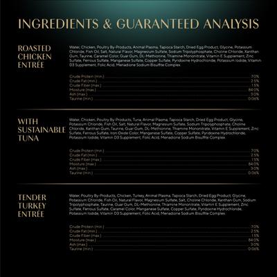 Tuna: Water, Chicken, Poultry By-Products, Tuna, Animal Plasma, Tapioca Starch, Dried Egg Product, Glycine, Potassium Chloride, Fish Oil, Salt, Natural Flavor, Magnesium Sulfate, Sodium Tripolyphosphate, Choline Chloride, Xanthan Gum, Taurine, Guar Gum, Dl-Methionine, Thiamine Mononitrate, Vitamin E Supplement, Zinc Sulfate, Ferrous Sulfate, Iron Oxide Color, Manganese Sulfate, Copper Sulfate, Pyridoxine Hydrochloride, Potassium Iodide, Vitamin D3 Supplement, Folic Acid, Menadione Sodium Bisulfite Complex.