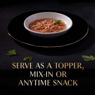 - Ya sea que lo sirva con la comida para gatos o como un refrigerio independiente, su gato disfrutará de los tiernos trozos de pollo y atún servidos en un caldo delicado.