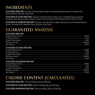 Receta de pollo y atún Receta de camarones: Pollo, caldo de pollo, agua, camarones, atún, almidón de tapioca modificado, aceite de girasol, sabor natural, glicina, goma guar.
