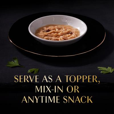 - Ya sea que lo sirva con la comida para gatos o como un refrigerio independiente, su gato disfrutará de los tiernos trozos de pollo, atún y camarones servidos en un caldo delicado.