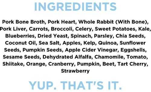 Pork Bone Broth, Pork Heart, Whole Rabbit (With Bone), Pork Liver, Carrots, Broccoli, Celery, Sweet Potatoes, Kale, Blueberries, Dried Yeast, Spinach, Parsley, Chia Seeds, Coconut Oil, Sea Salt, Apples, Kelp, Quinoa, Sunflower Seeds, Pumpkin Seeds, Apple Cider Vinegar, Eggshells, Sesame Seeds, Dehydrated Alfalfa, Chamomile, Tomato, Shiitake, Orange, Cranberry, Pumpkin, Beet, Tart Cherry, Strawberry