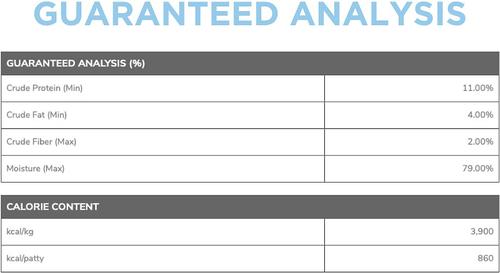 ME = 3,900 kcal/kg; 860 kcal/patty