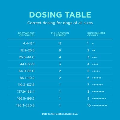 Sileo is administered onto the lining of the mouth by placing the gel between your dog’s cheek and gums, allowing for transmucosal absorption. Since the gel is absorbed through the skin, it should not be swallowed by your dog. If the gel is swallowed, the product may not be effective and do not repeat the dose for at least two hours. A dose greater than 6 dots should be divided evenly between both sides of the mouth. Use gloves in the administration of Sileo. The dosing chart is by body weight and associated number of dots. Each dot is 0.25 mL; 4 dots is equivalent to 1 mL. See instructional video above for more detailed instructions.